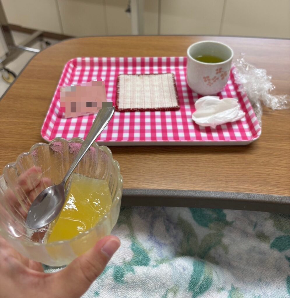 昼食のぜりー。助産師さんにこれだけでごめんね、と言われる。陣痛に比べたら全然良い。